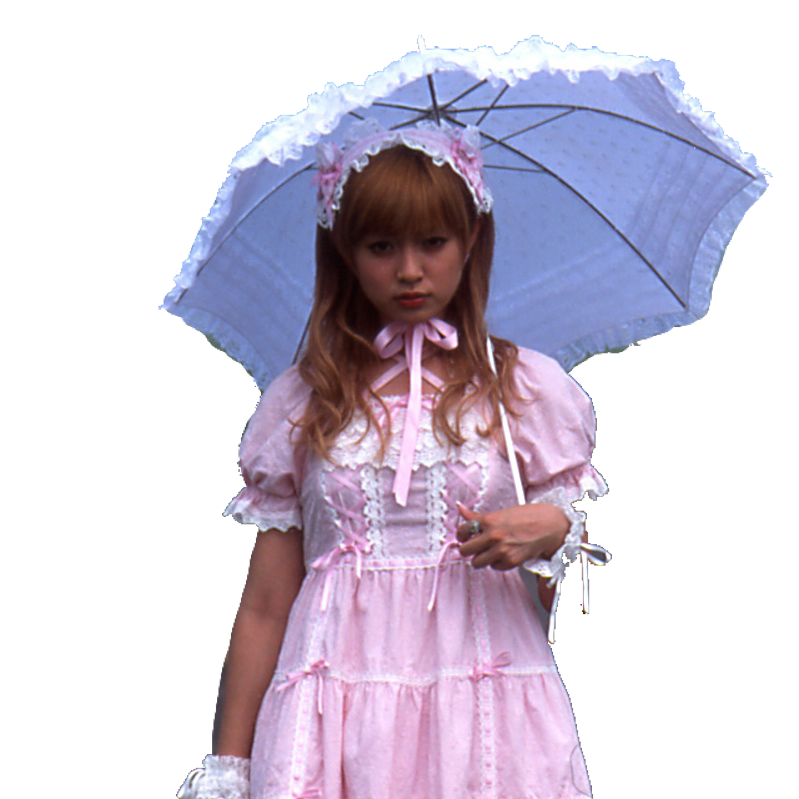 the visuals of this movie do not disappoint- the saturation, the random cutaways, the sudden shifts from fantasy to reality to flashbacks to cartoon- i'm someone who admittedly will rarely watch anything if it isn't animated (childish, i know...) and yet i was never bored or turned off by kamikaze girls. it's probably the exaggerated ...well, everything, as well as momoko's stellar coordinates and ichigo's animated gestures. every scene is brightly colored and the sequences where things go flying or it cuts to tv or animated townspeople are my absolute favourites. i think some of momoko's pieces have made their way into my own wishlist... aha..